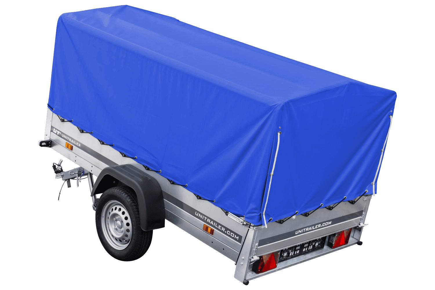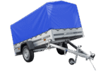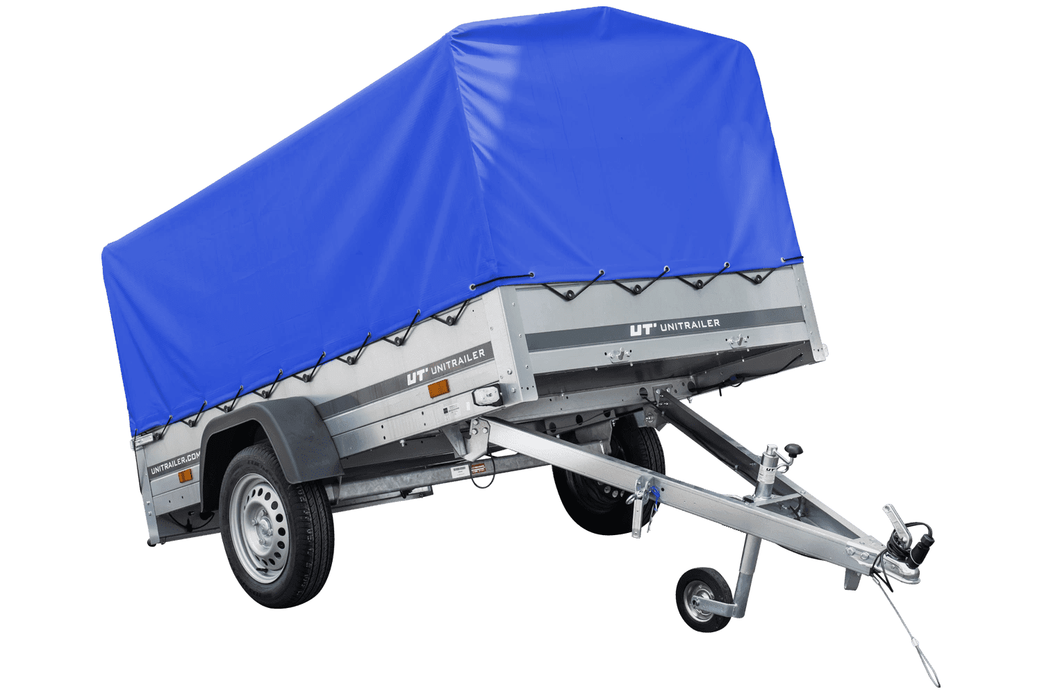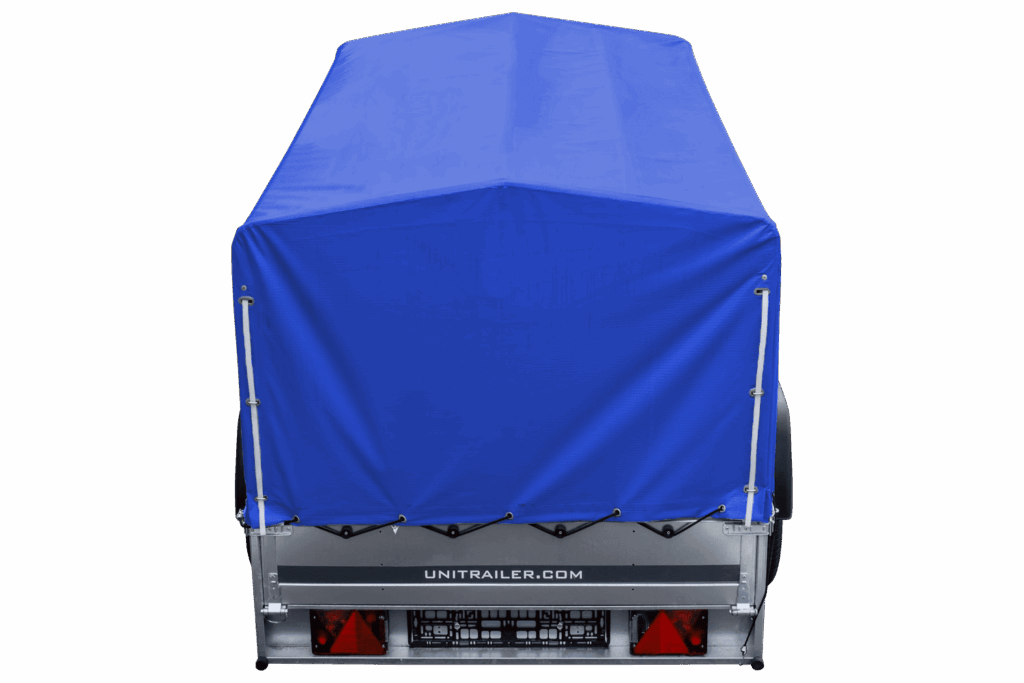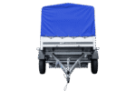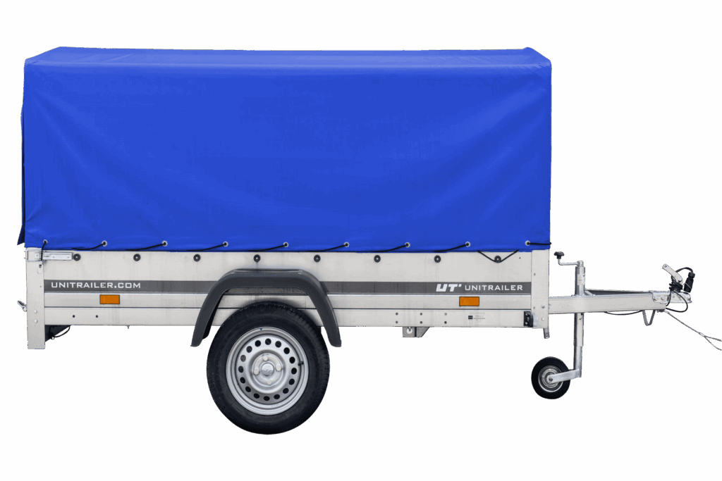 Auto Anhänger 230×125 Garden Trailer 230 KIPP Unitrailer 750 kg mit Stützrad, blauer Hochplane und Hochspriegel